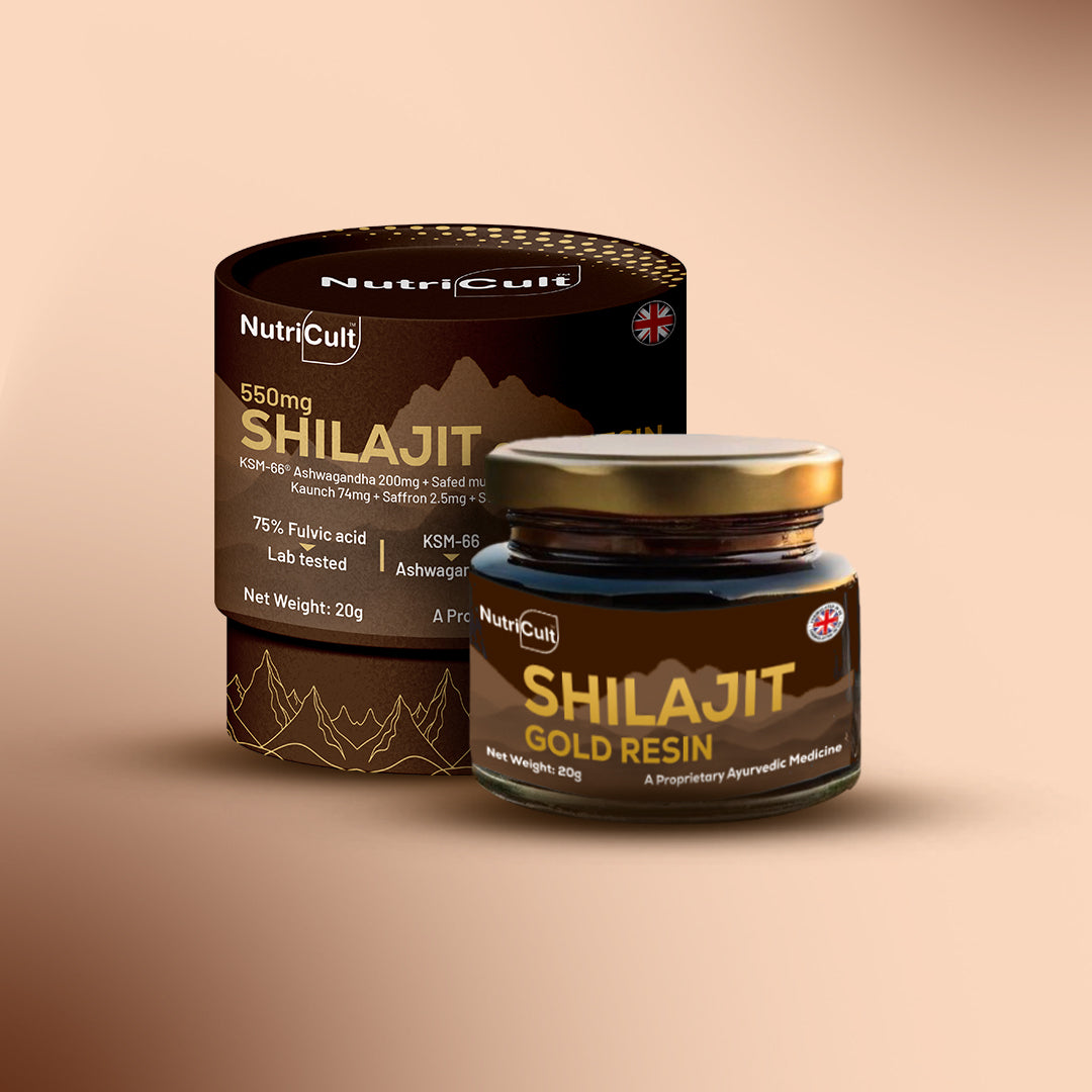 When your body demands more, elevate your everyday with the strength of nature refined by science. Nutricult Shilajit gold resin is your daily dose of energy, focus, and inner balance, designed to help you perform better, recover faster, and stay resilient. Powered by a clinically-backed blend of Shilajit, KSM-66® Ashwagandha, and six Ayurvedic super herbs, this potent resin fuels stamina, supports testosterone, reduces stress, and enhances mental clarity, so you can show up at your best, every day.